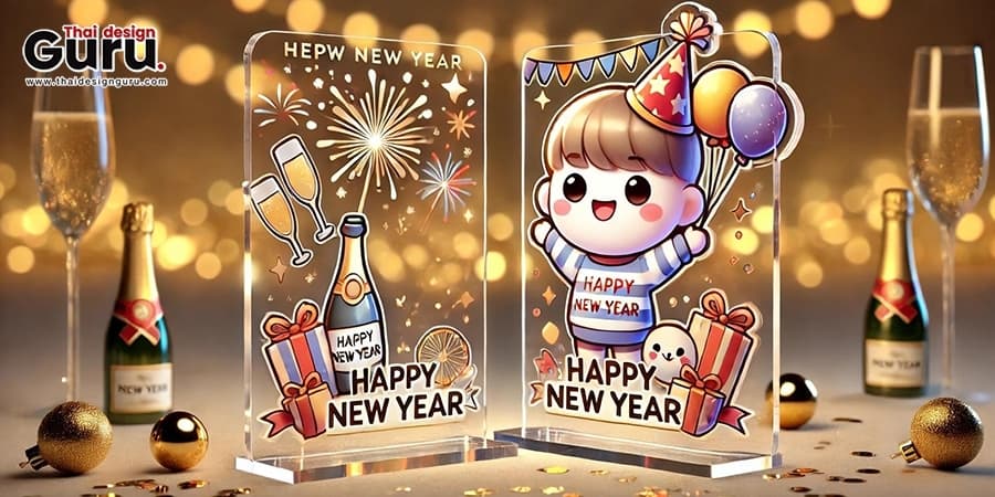 ตัวอย่างไอเดียที่หลายคนเอาไปใช้ได้ เช่น การออกแบบอะคริลิคสแตนดี้ในธีมปีใหม่ที่มีการออกแบบสดใสและเต็มไปด้วยความสนุกสนาน สแตนดี้พร้อมโลโก้ มีภาพตัวการ์ตูนเด็กน่ารัก สวมหมวกปาร์ตี้ ล้อมรอบด้วยลูกโป่ง ของขวัญ และองค์ประกอบเฉลิมฉลอง พร้อมข้อความ “Happy New Year” ส่วนอีกอันมีธีมการเฉลิมฉลองที่มีแก้วแชมเปญ ขวดแชมเปญ พลุ และกล่องของขวัญ พร้อมคำอวยพรปีใหม่เช่นกัน ไม่เพียงแต่เทศกาลสากลที่ได้รับความสนใจเท่านั้น เทศกาลไทยก็สามารถนำมาเป็นไอเดียสั่งทำของที่ระลึกได้เช่นกัน