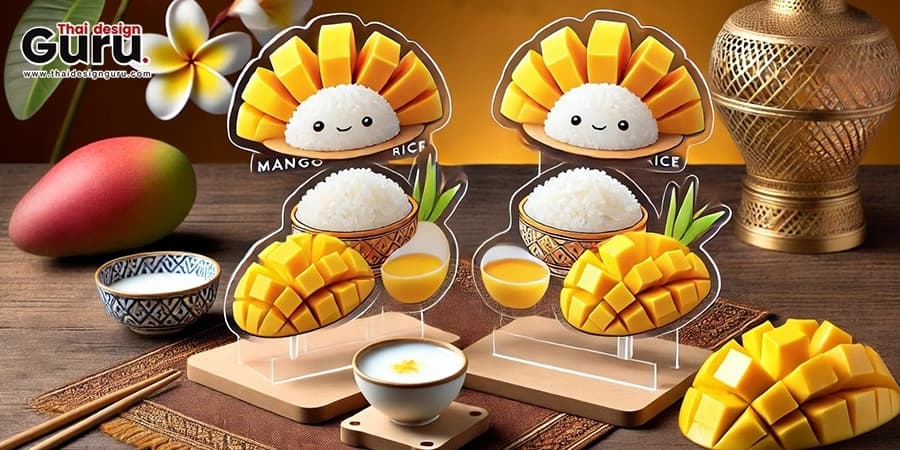- การออกแบบ: สแตนดี้เป็นภาพการ์ตูนจานข้าวเหนียวมะม่วงที่มีข้าวเหนียวสีขาวและมะม่วงสีเหลืองสด พร้อมราดน้ำกะทิและงาขาวเพื่อเพิ่มความสมจริง