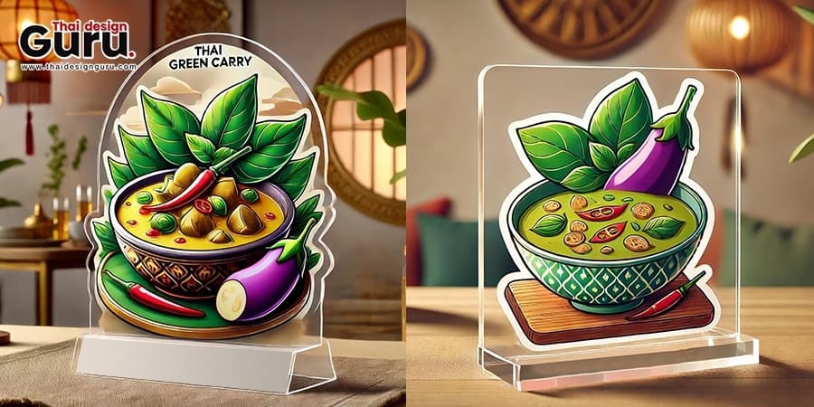 อาหารไทยยอดนิยม: อาหารไทยเป็นอีกหนึ่งสัญลักษณ์ที่สำคัญของประเทศไทยและเป็นที่รู้จักทั่วโลก การนำอาหารไทยยอดนิยมมาดีไซน์เป็นอะคริลิคสแตนดี้ในรูปแบบที่น่ารักและสนุกสนาน จะเป็นที่ดึงดูดสำหรับนักท่องเที่ยวและนักสะสมที่ชื่นชอบอาหารไทย อะคริลิคสแตนดี้ที่แสดงลวดลายอาหารไทยชื่อดัง เช่น ผัดไทย แกงเขียวหวาน หรือข้าวเหนียวมะม่วง ลวดลายจะถูกออกแบบให้น่ากินและมีสีสันสดใส ทำให้อาหารดูโดดเด่นและชวนรับประทาน