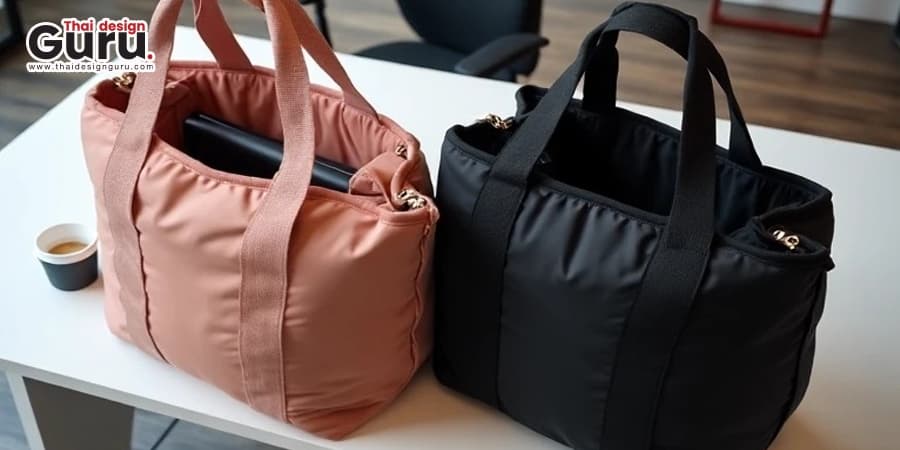มักมีโครงสร้างที่ยืดหยุ่นพร้อมซับในเสริมความแข็งแรง หูหิ้วมักเป็นสายไนล่อนแบบเรียบหรือสายหนังเสริมความทนทาน มีดีไซน์ปากกระเป๋าแบบซิปหรือกระดุมแม่เหล็กเพื่อความปลอดภัยขณะใช้งาน สาวๆ วันทำงานแบบไหนที่เหมาะกับดีไซน์นี้