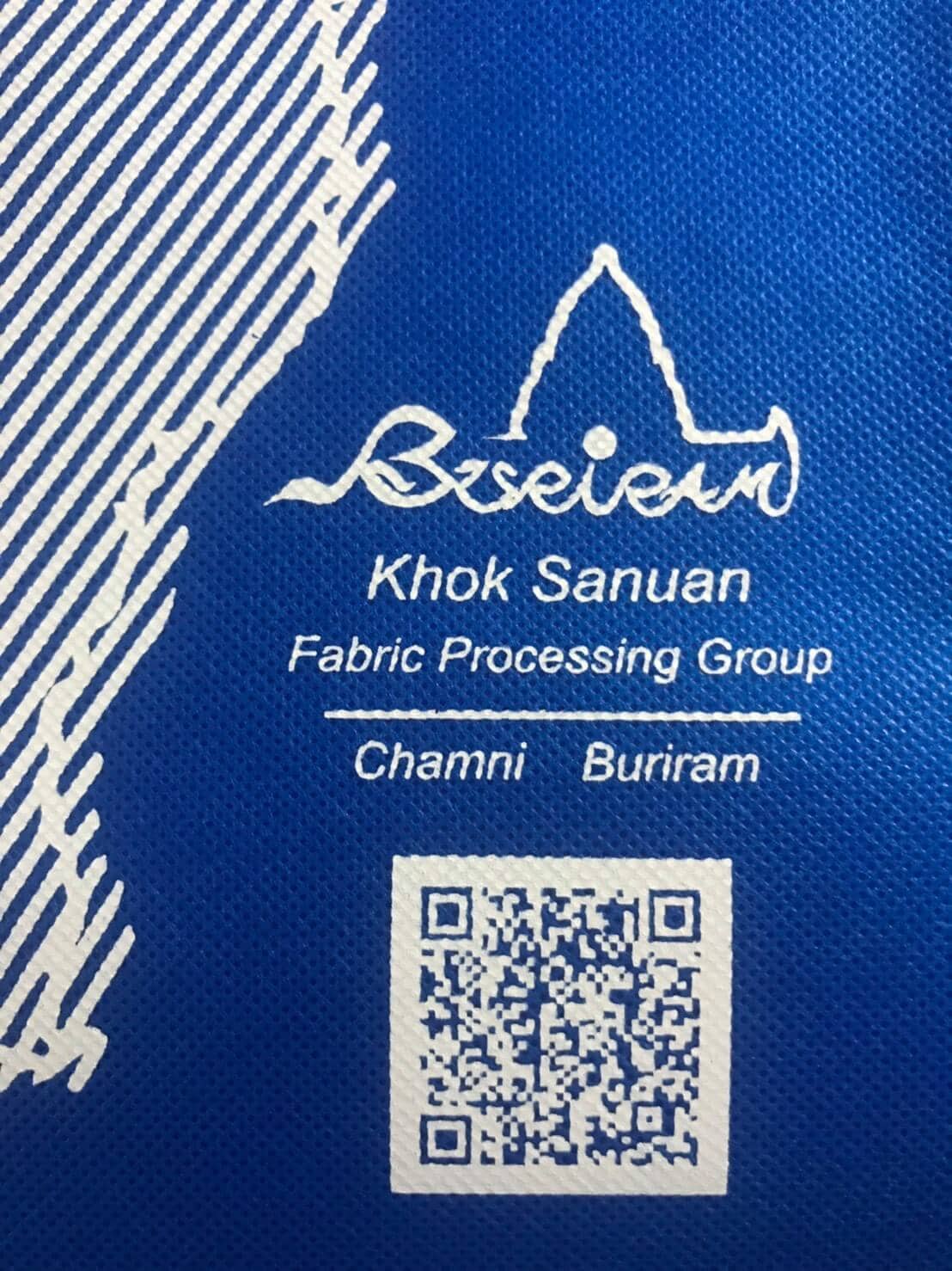 กระเป๋าผ้าสปันบอนด์ เจาะรู หูหิ้ว สกรีนโลโก้สีขาว พร้อมแถบริบบิ้นโลโก้ และ QR CODE ที่ทำให้ลูกค้าได้จดจำและสามารถสแกน QR CODE เพื่อรับข่าวสารหรือที่มาของสินค้าได้