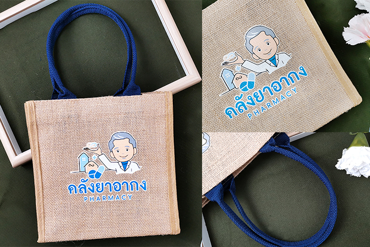 “รักษ์โลก เลิกพลาสติก” โดยถุงพลาสติกต้องใช้เวลา 450 ปี ในการย่อสลาย โดยกรมการแพทย์มีการใช้ถุงพลาสติกจำนวน 9 ล้านใบ ซึ่งหากสามารถลดการใช้ได้จะสามารถลดปัญหาขยะได้มากขึ้น ดังนั้นจึงมีการรณรงค์ให้สถาบัน/โรงพยาบาลของกรมการแพทย์จำนวน 30 แห่ง ให้เลิกใช้ถุงพลาสติก โดยหันมาใช้ถุงผ้าใส่ยากลับบ้านแทน และร้านขายยาต่างๆ ก็มีมาตรการเช่นเดียวกับทางโรงพยาบาล คือซื้อยาไม่ใส่ถุงพลาสติก แต่ให้ลูกค้าพกถุงผ้าเพื่อมาใส่ยากลับบ้านแทนนั่นเอง ขอบคุณ ร้านคลังยาอากง ที่สั่งผลิตกระเป๋าผ้ากระสอบกับเรา โดยเลือกเป็นกระเป๋าถือหิ้วแบบวงกลม สายกระเป๋าสีน้ำเงิน สกรีนโลโก้ ซึ่งสั่งผลิตทั้งหมด จำนวน 300 ชิ้น