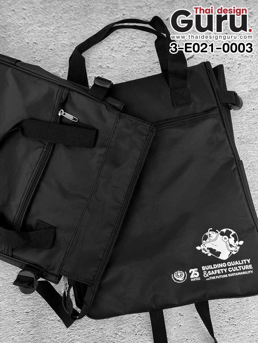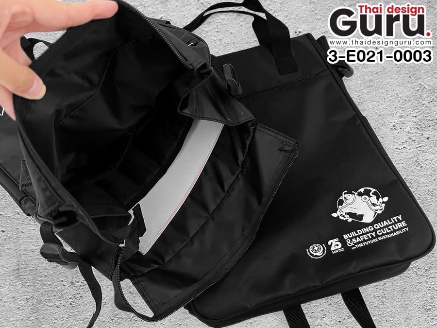 กระเป๋าเป้สีดำดีไซน์เรียบหรูรุ่นนี้ โดดเด่นด้วยลวดลายสกรีน "25TH : Building Quality & Safety Culture" ซึ่งเป็นการออกแบบที่สื่อสารถึงวาระครบรอบ 25 ปีขององค์กรได้อย่างชัดเจน เหมาะสำหรับใช้เป็นของแจกในกิจกรรมส่งเสริมภาพลักษณ์องค์กร สร้างการจดจำแบรนด์ให้คงอยู่ในใจลูกค้าได้อย่างยาวนาน