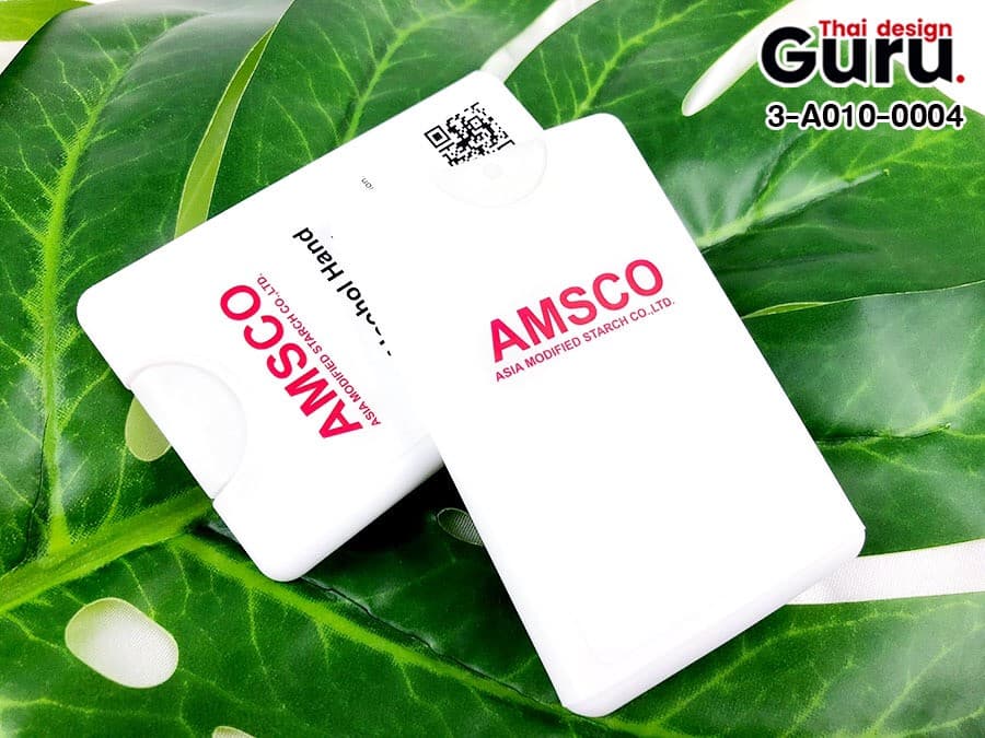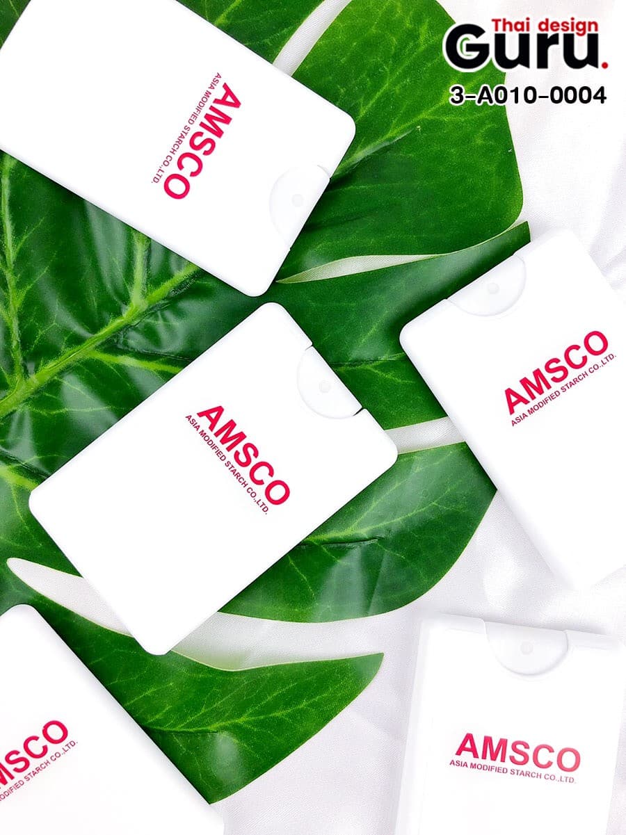 ตัวอย่างผลงานการรับผลิตสเปรย์แบบการ์ด พิมพ์โลโก้แบรนด์ Amsco พร้อมรายละเอียดของผลิตภัณฑ์ การสั่งพิมพ์ ฉลากบนสเปย์แอลกอฮอล์ สามารถใส่รายละเอียดของคิวอาร์โค้ด ข้อความ รูปภาพ รวมถึงลวดลายที่น่ารัก ที่ช่วยให้ของพรีเมี่ยมของแบรนด์ ดูน่าใช้งานยิ่งขึ้น