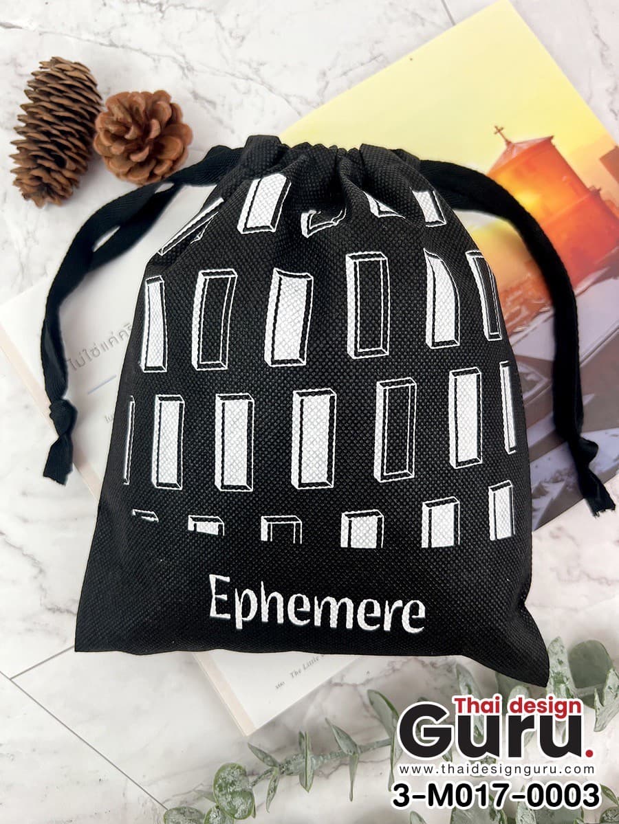ถุงผ้าหูรูดเป็นงานออกแบบเพื่อการใช้งานจริงและการสร้างภาพลักษณ์แบรนด์ไปพร้อมกัน ผลิตจากผ้าสปันบอนด์สีดำเคลือบที่มีคุณสมบัติกันละอองน้ำและมีน้ำหนักเบา เย็บทรงตั้ง มีเชือกรูดสีดำทั้งสองฝั่งเพื่อความสะดวกในการใช้งาน โดยด้านหน้าสกรีนลายกราฟิกที่ทำให้กระเป๋าดูโดดเด่นและเป็นเอกลักษณ์พร้อมชื่อแบรนด์ "Ephemere"