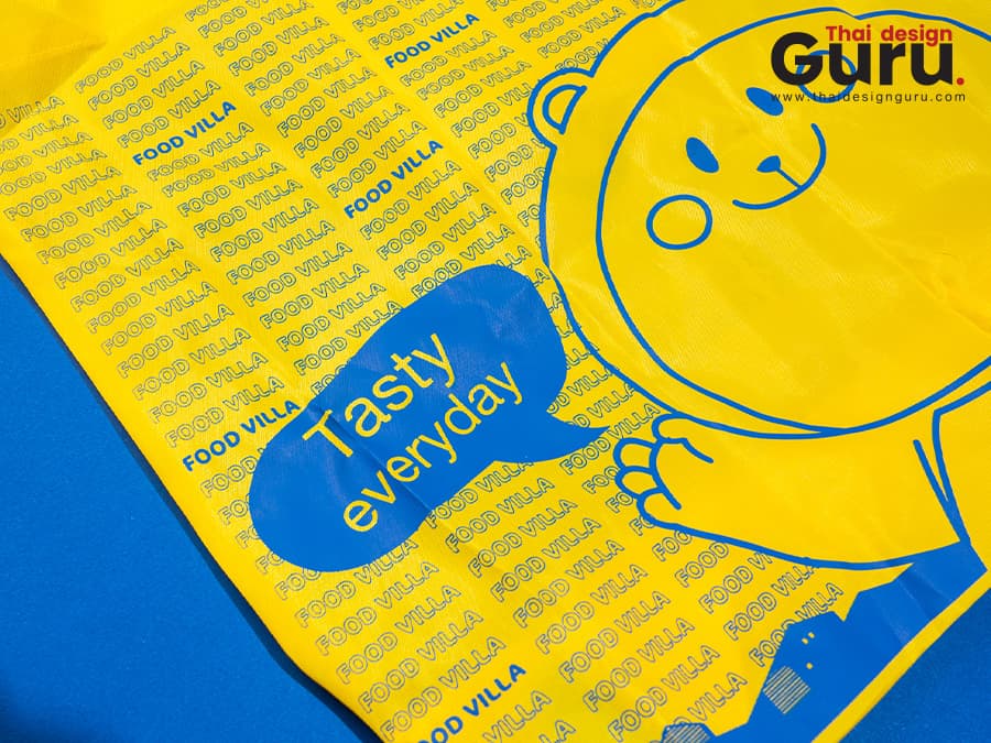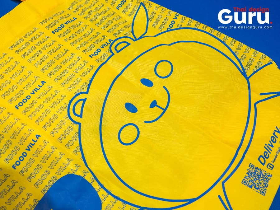 สั่งทำถุงผ้าพรีเมี่ยมสำหรับแจกหรือเป็นของแถมของสมนาคุณให้ลูกค้า ที่พกพาง่าย ประหยัดพื้นที่และใช้ได้ทุกเวลา  กับรูปแบบการสั่งผลิตถุงผ้าพับได้ผ้าร่ม ทรงTote สีเหลืองสด สกรีนโลโก้ แบรนด์ Food villa พิมพ์เต็มใบหน้า-หลังสีคมชัด ราคาสุดคุ้ม พร้อมกระเป๋าขยายก้นใส่ของได้เยอะซะใจ