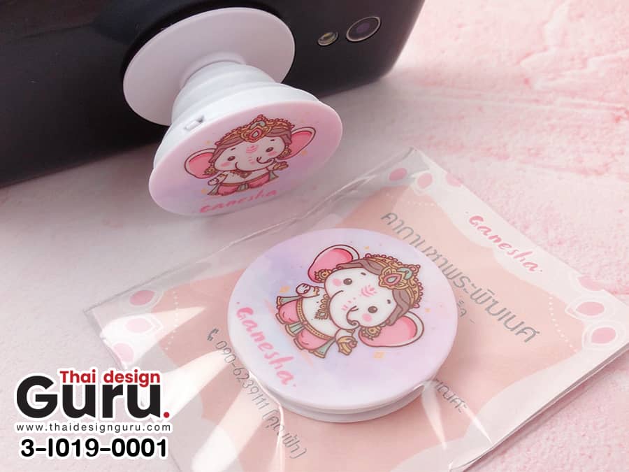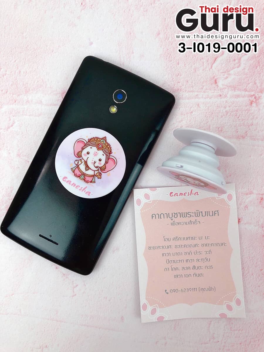 ตัวอย่างผลงานการรับผลิต griptok สายมูเตลู พร้อมการ์ดรอง พิมพ์ลายพระพิฆเนศ โทนสีชมพู ทำให้เกิดไอเทมสายมูที่เป็นมิตรขึ้น กริ๊บต็อกที่ออกแบบเลือกใช้สีที่สื่อถึงความเป็นสิริมงคล เช่น สีทอง สีแดง สีชมพู หรือสีที่สอดคล้องกับราศีหรือวันเกิด