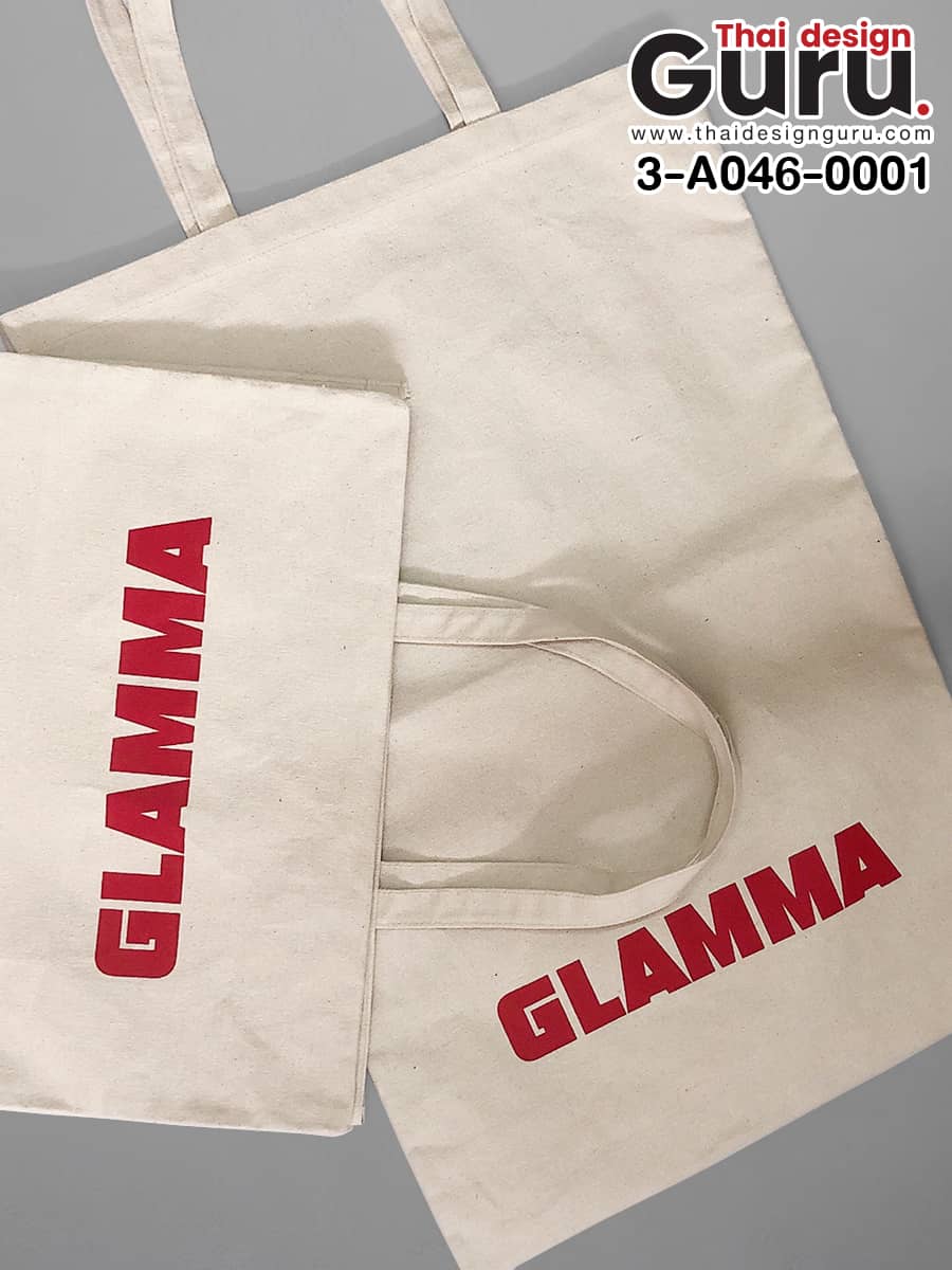 กระเป๋าชอปปิ้งผ้าดิบถูกดีไซน์ด้วยรูปทรงที่เรียบง่าย ด้วยขนาดที่สั่งทำเป็นขนาดใหญ่พิเศษทำให้กระเป๋าผ้าพิมพ์แบรนด์หูหิ้วดูสะดุดตา ตัวอย่างผลงานการรับผลิตกระเป๋าหูหิ้วผ้าดิบขนาดใหญ่ พร้อมสกรีนลาย Glamma