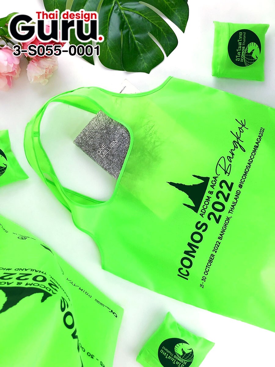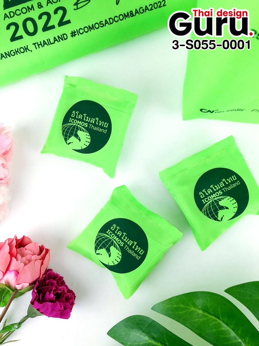 สำหรับงานICOMOS 2022 เลือกโทนสีเนื้อผ้าเป็นสีเขียวตองคล้ายกับสีเขียวสะท้อนเสียง ตัวถุงผ้าร่มพับเก็บพิมพ์สกรีนด้วยโทนเขียวเข้ม เข้ากับโทนสีของถุงผ้า พื้นที่สกรีนบนถุงผ้าพับเก็บได้ สามารถพิมพ์โลโก้ ข้อความ ภาพ หรือสัญลักษณ์ลงไปได้ กรณีที่สั่งทำถุงผ้าเป็นถุงจัดงาน