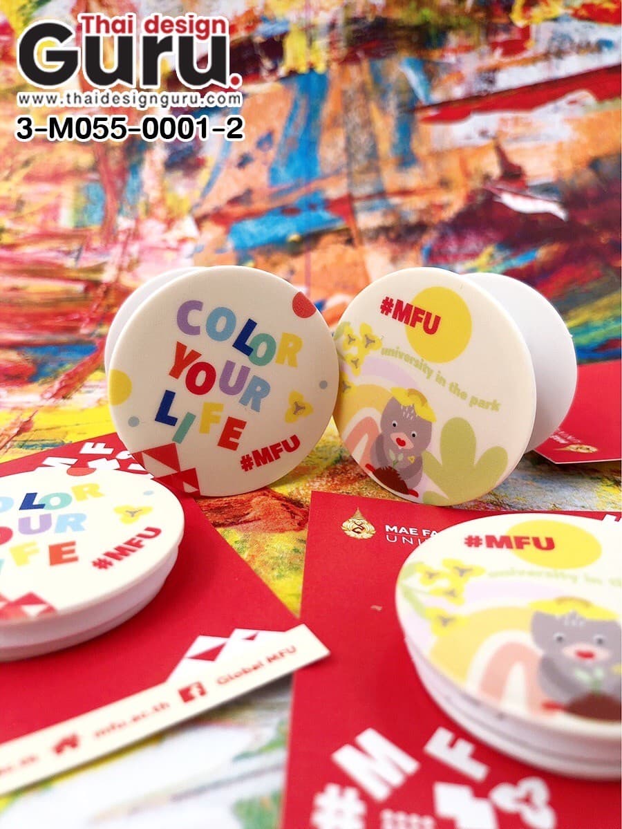 ตัวอย่างไอเดียการผลิตGriptok ของชำร่วยของแจกนักศึกษาน่ารักๆ แบบกลมพิมพ์ลาย MFU ของมหาวิทยาลัยแม่ฟ้าหลวง ที่สร้างสรรค์ไอเดียดีไซน์ที่ติดหลังโทรศัพท์มือถือกริ๊บต็อคได้ออกมาอย่างน่ารัก น่าสะสม มีหลายแบบให้เลือก มาพร้อมการ์ดรองกระดาษพิมพ์ลายโทนสีประจำมหาวิทยาลัย
