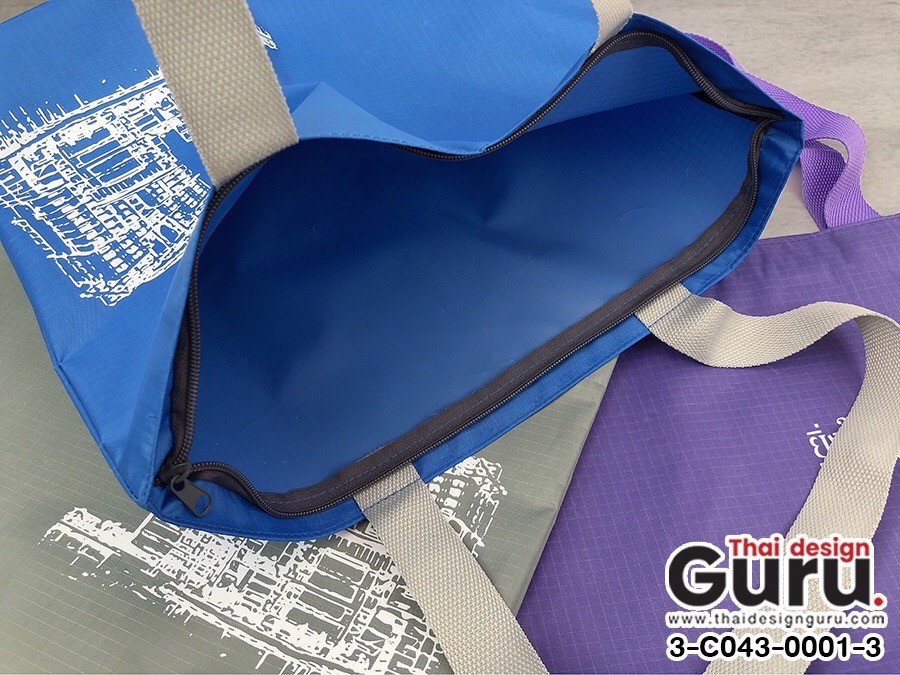 โดยกระเป๋าผ้ากันน้ำพิมพ์ลายด้านหน้าเป็นเนื้อผ้าผิวเรียบเหมือนวัสดุผ้าร่มผิวสัมผัสลายตาราง สามารถสั่งทำเป็นกระเป๋าชอปปิ้งแฟชั่นขยายก้นไม่ข้าง เพื่อเพิ่มพื้นที่ให้ใส่ของได้มากยิ่งขึ้น รูปแบบของที่ระลึกขวัญใจองค์กรและหน่วยงานราชการได้รับความนิยมทุกๆ ปี