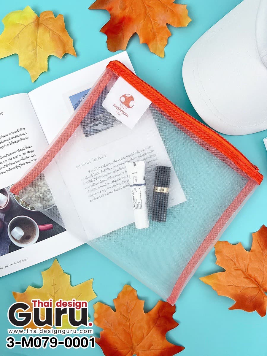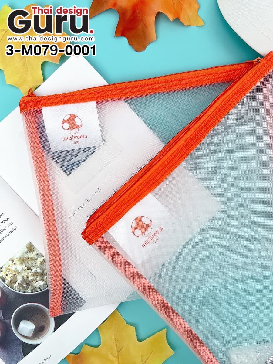จากภาพจะเห็นว่าดีไซน์ของซองมีความเรียบง่ายแต่โดดเด่น เนื่องจากใช้ผ้าตาข่ายโปร่งใสที่ช่วยให้เห็นของด้านในได้อย่างชัดเจน เพิ่มความสะดวกในการหยิบของ โดยซิปสีส้มสดใสทำหน้าที่เป็นทั้งจุดเด่นทางสายตาและเพิ่มการจดจำแบรนด์ ขณะที่โลโก้ "MUSHROOM TRAVEL" ที่พิมพ์บนการ์ดภายในซองนั้นอยู่ในตำแหน่งที่มองเห็นง่าย ทำให้ภาพรวมของสินค้าเป็นเหมือนสื่อโฆษณาขนาดพกพาที่สามารถสื่อสารแบรนด์ได้ทุกที่ทุกเวลา