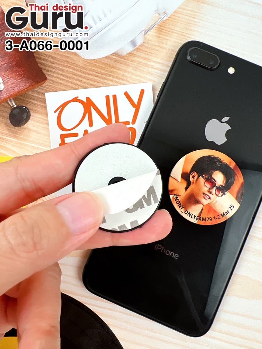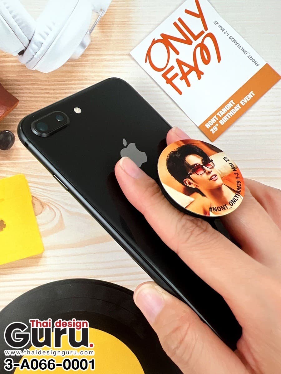 รูปแบบ Pop Socket ที่ระลึกมีขนาดกะทัดรัด พอดีกับการจับถือ และรองรับการติดตั้งกับเคสมือถือทุกประเภท ฐานกาวแน่นพิเศษสามารถติดซ้ำได้หากต้องการย้ายตำแหน่งโดยไม่ทิ้งคราบกาว วัสดุพลาสติกเกรดพรีเมียมที่ใช้ในการผลิตช่วยให้สินค้ามีน้ำหนักเบาแต่คงทน ใช้งานได้ยาวนาน งานพิมพ์ Direct Print บนพื้นผิวด้านบนให้ภาพคมชัด รายละเอียดไม่หลุดลอกแม้ใช้งานต่อเนื่อง โทนสีสดใสช่วยให้ภาพศิลปินนนท์ ธนนท์ โดดเด่นสะดุดตา ทุกครั้งที่หยิบจับโทรศัพท์