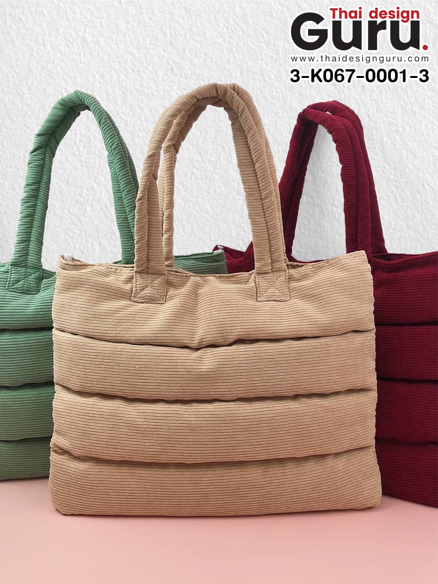 กระเป๋าผ้าลูกฟูกทรงสวยๆ แบบแบนสะพายข้างเย็บเพิ่มดีไซน์ให้สวยยิ่งขึ้น ด้วยการเย็บร่องแบบขวางให้มีมิติ เพื่อให้เส้นใยหรือฟองน้ำยึดเกาะกับตัวผ้าได้ดียิ่งขึ้น ทำให้ได้แบรนด์สินค้าได้กระเป๋าผ้าลูกฟูกที่มากกว่าความสวยงาม แต่ทนทานใช้งานได้ยาวนาน