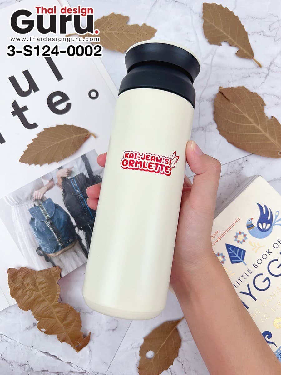ในภาพนี้คือกระบอกน้ำทรงกระบอก สีขาวครีมตัดกับฝาดำ ดูเรียบหรูและใช้งานง่าย ด้านหน้าสกรีนลายแบรนด์ “KAI-JEAW:S ORMLETTE” ด้วยสีแดง เพื่อให้ตัดกับสีกระบอกน้ำ เพื่อให้ลายสกรีนดูเด่นและดูสะดุดตา ทำให้มองเห็นอย่างชัดเจน ช่วยเพิ่มความน่าสนใจ สร้างความประทับใจและความน่าจดจำให้กับแบรนด์