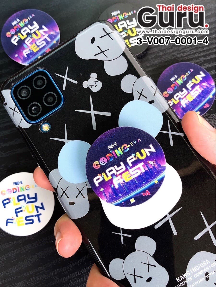 ตัวอย่างผลงานสั่งทำที่ติดมือถือ Pop socket แบบกลมของชำร่วย ถูกๆพิมพ์ลาย Play fun fest พิมพ์ลายไม่จำกัดสี กริ๊บต๊อกฐานสีดำ ของแจกกลุ่มสายไอทีสำหรับโปรโมทองค์กรให้เป็นที่รู้จักมากยิ่งขึ้น Griptok หรือที่ติดโทรศัพท์มือถือพิมพ์ลายกลายเป็นกิมมิคเล็กๆ ที่เป็นตัวกลางสร้างความผูกพันธ์ของผู้ที่มาร่วมกิจกรรมสนุกให้มีของที่ระลึก ของสะสมกลับไป