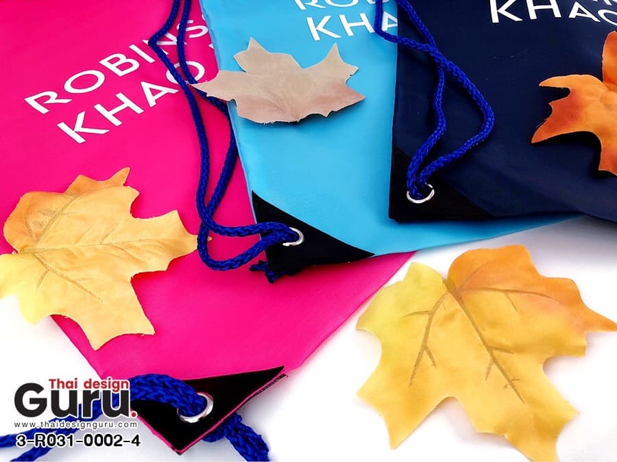 ตัวอย่างผลงานรับทำถุงผ้าร่มสะพายหลัง เป้หูรูด สกรีนโลโก้ Robinson khao lak ของพรีเมี่ยมที่ผลิตเพื่อประชาสัมพันธ์ธุรกิจโรงแรม หรืองานเปิดตัวบริการ ถุงผ้าหูรูดขนาดใหญ่ที่ใส่สินค้าได้มากมาย ยังสร้างจุดเด่นให้กับคนในงานได้หันมอง และสร้างการจดจำ รวมภาพลักษณ์ที่ดีที่ทางแบรนด์ หน่วยงาน อยากจะนำเสนอให้คนทั่วไปได้รู้จักมากขึ้นอีกด้วย