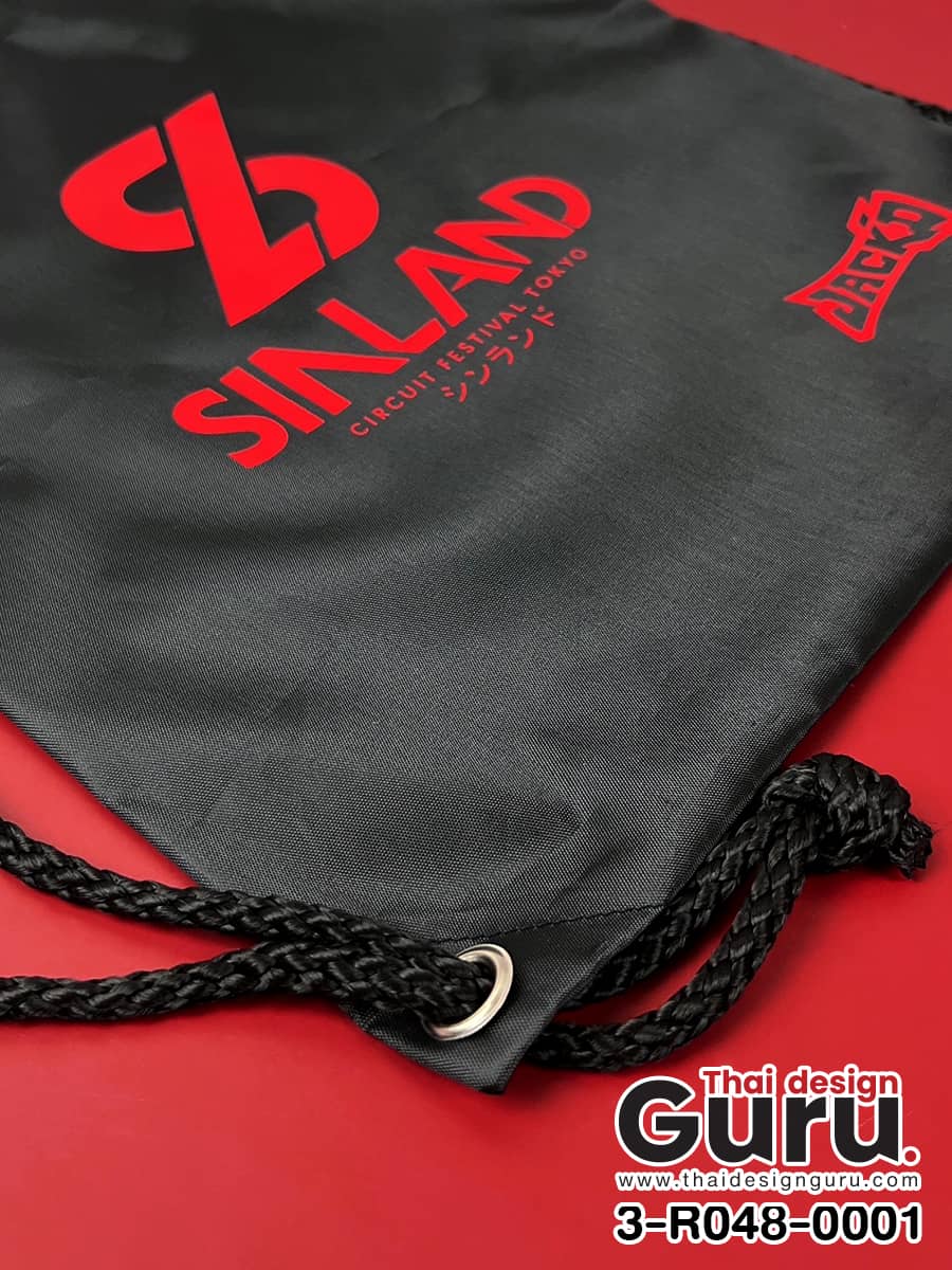 ตัวอย่าง กระเป๋าเป้หูรูด ผ้าร่ม สีดำ พร้อมสกรีนลาย SINLAND ที่มีความโดดเด่นด้วยการใช้สีแดงบนพื้นสีดำ ซึ่งสร้างความคอนทราสต์ที่ชัดเจน ทำให้โลโก้ของแบรนด์ “SINLAND” และสัญลักษณ์เด่นชัดเจนเมื่อมองในระยะไกล และเน้นความเป็นเอกลักษณ์ของแบรนด์ได้ดี