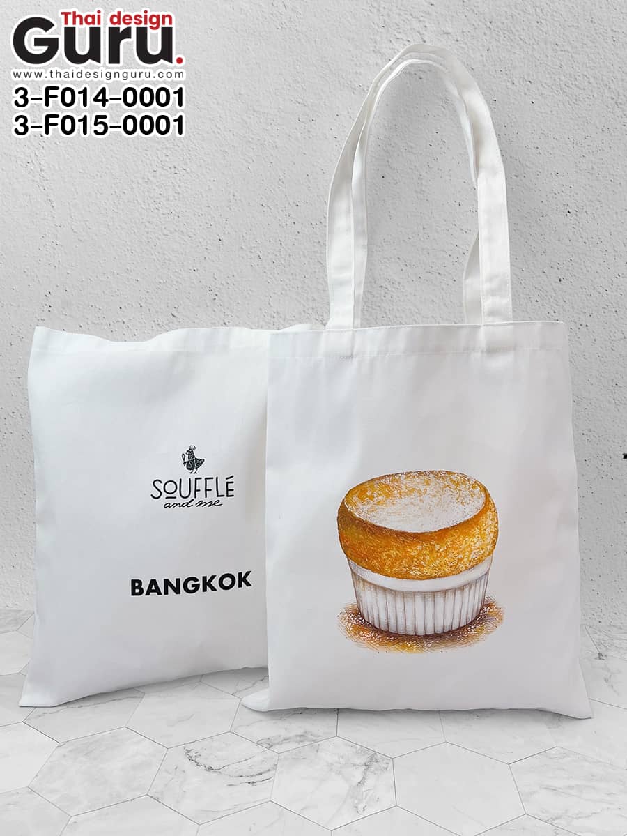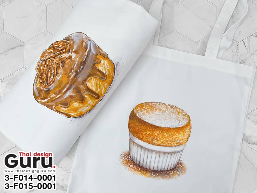 ตัวอย่างเช่น กระเป๋าหูหิ้ว ผ้าดิบ สีขาว สกรีนลายขนม Souffle และ Brioche ที่เน้นความนุ่มนวล ละเอียดอ่อน สื่อถึงความหรูหราของขนมที่ใส่ใจทุกรายละเอียด ลวดลายทั้งสองช่วยเพิ่มความพิเศษและสร้างความรู้สึกที่ดีเมื่อผู้ใช้ถือกระเป๋า ช่วยเสริมภาพลักษณ์แบรนด์ให้ดูมีระดับ