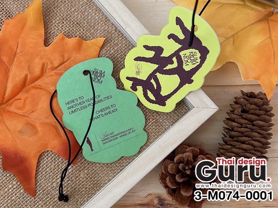 ตัวอย่างผลงานการสั่งผลิตแผ่นหอมปรับอากาศ กระดาษพิมพ์ลาย แบรนด์ Summumbonum แผ่นหอมปรับอากาศมาพร้อมดีไซน์ลายใบไม้สุดเก๋ในโทนสีเขียวและเหลือง เพิ่มความมีชีวิตชีวาและความสดใสให้กับทุกจุดที่แขวนอยู่ ลวดลายถูกพิมพ์ด้วยความละเอียดสูง ผสมผสานความทันสมัยและเอกลักษณ์เฉพาะตัว ราคาถูก พร้อมแพ็ค 1 ต่อ 1 พร้อมแจกแถมสินค้า