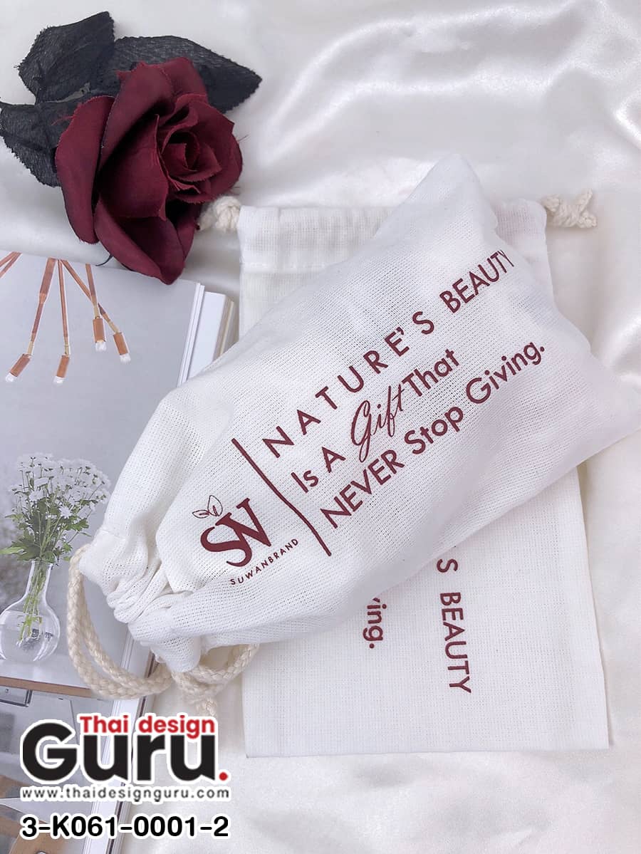 การเลือกผลิตภัณฑ์ถุงผ้าหูรูดผ้าดิบพิมพ์ลาย หรือโลโก้พร้อมข้อความทั้งหน้าและหลัง คือบรรจุภัณฑ์ที่ทำให้สินค้าด้านในดูมีคุณค่าและน่าใช้มากขึ้น เพื่อความรู้เซอร์ไพรส์ ตื่นเต้น ก่อนมองเห็นสินค้าที่อยู่ด้านใน ผ่านถุงผ้าดิบสีขาว แนวมินิมอลที่ดีไซน์ร่วมสมัยตลอดกาล