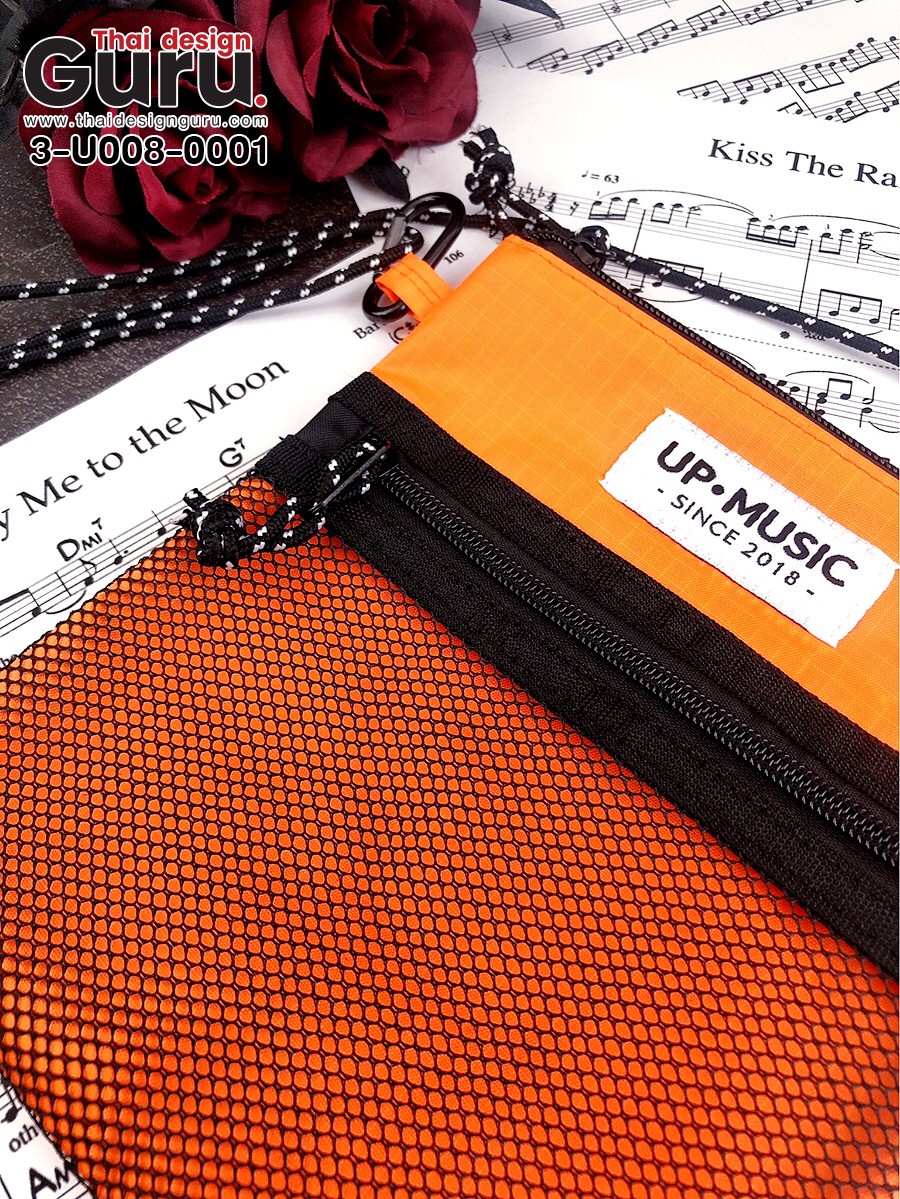 ผลงานรับทำกระเป๋าผ้าตาข่ายซิปรูดเชือกสะพายข้าง กันน้ำแบรนด์ up-music ผลิตด้วยผ้าลิปต็อคผิวสัมผัสเป็นผ้าลายตาราง กันน้ำ คุณสมบัติของผ้าแบบเดียวกับผ้าร่ม ซึ่งผ้าร่มจะมีแบบลายผิวเรียบ เรียกว่าผ้า 210D / 420D สำหรับผ้าร่มกันละอองน้ำลายผิวตาราง เราจะเรียกว่าผ้า ลิปต็อค