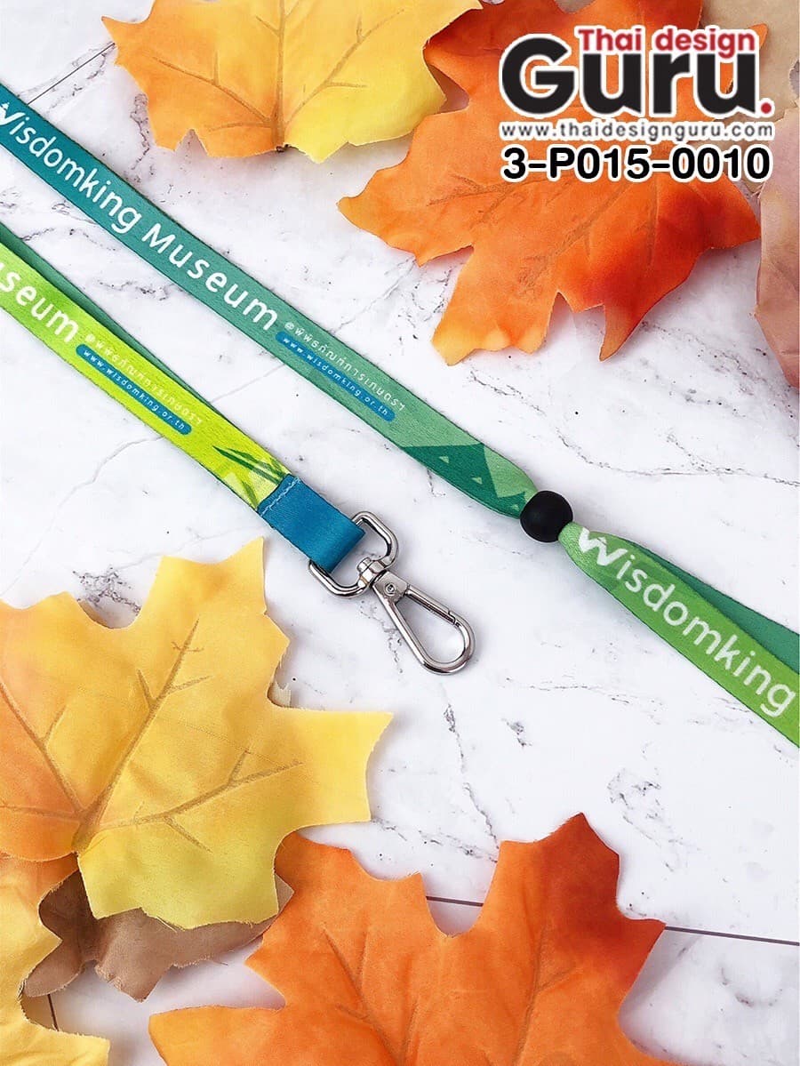 ตัวอย่างการรับผลิตสายคล้องคอห้อยบัตรสายแฟชั่น พิมพ์ลายเต็มลาย ของ wisdomking museum ที่ดีไซน์สายคล้องเป็นโทนสีฟ้าเขียวพร้อมข้อความบนตัวสาย ดีไซน์ของสายมีตัวปรับระยะให้ง่ายต่อการใช้งาน พร้อมตะขอเกี่ยวเงินก้ามปู ใช้เวลาผลิต 21-30 วัน จำนวนขั้นต่ำ 300 ชิ้น