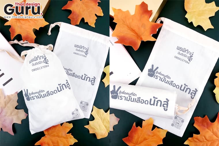 รับทำถุงผ้าหูรูดใส่ของที่ระลึก ผ้าดิบสีขาว สกรีนลาย พรพิทักษ์