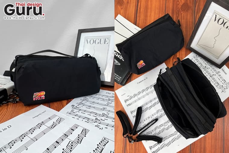 กระเป๋าผ้าร่ม Bottle Sacoche สีดำสกรีนลาย “AIA Spian-Real Madrid” เป็นกระเป๋าทรงยาวกะทัดรัด ดีไซน์มินิมอล ใช้ผ้าร่มคุณภาพที่ทนทานและกันละอองน้ำได้ดี ภายในแบ่งหลายช่องซิป พร้อมช่องใส่ขวดน้ำที่มีเชือกรูดช่วยยึดให้มั่นคง พกพาสะดวกด้วยสายสะพายปรับระดับได้ เหมาะทั้งใช้ในชีวิตประจำวันและในงานกิจกรรมแบรนด์