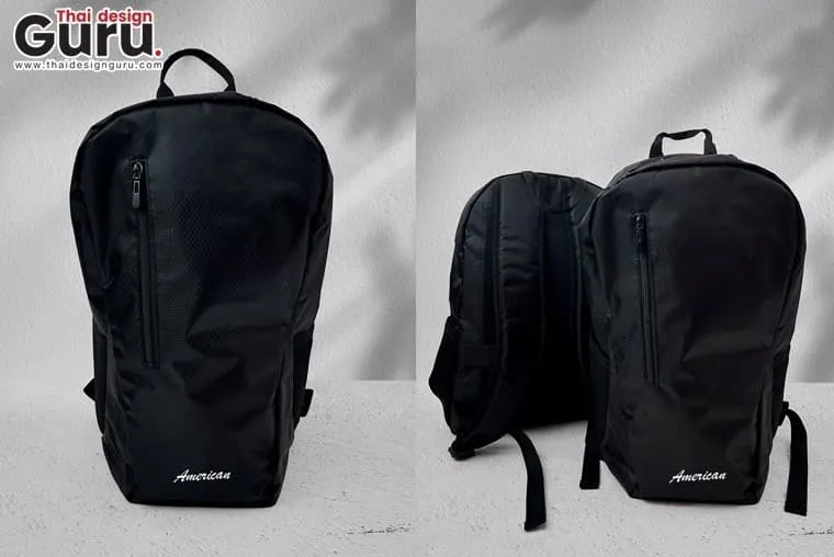 รับทำกระเป๋ากีฬาไนล่อนกันน้ำ สีดำ สะพายหลังพิมพ์แบรนด์ American ราคาถูก ออกแบบมาเพื่อรองรับการใช้งานที่หลากหลาย เจาะกลุ่มคนทำงาน นักเรียน ผู้รักสุขภาพ ท่องเที่ยว หรือใช้งานในชีวิตประจำวัน ตัวกระเป๋าผลิตจากผ้าไนล่อนคุณภาพสูงที่มีคุณสมบัติกันน้ำ ป้องกันฝุ่นละออง และทนทานต่อการใช้งานหนัก