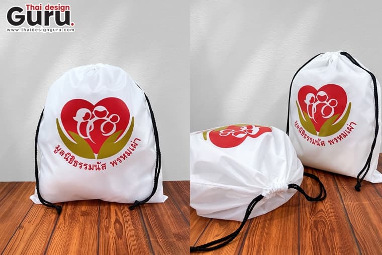 สั่งทำถุงยังชีพหูรูดสีขาว สกรีนลายแบรนด์ "มูลนิธิธรรมนัส พรหมเผ่า"